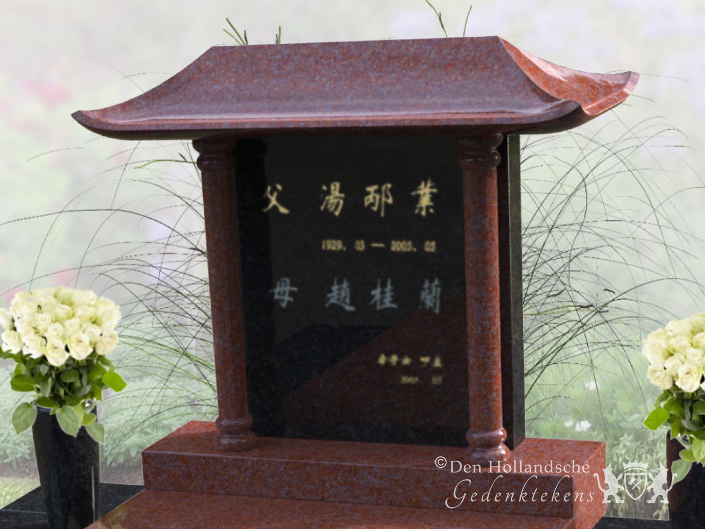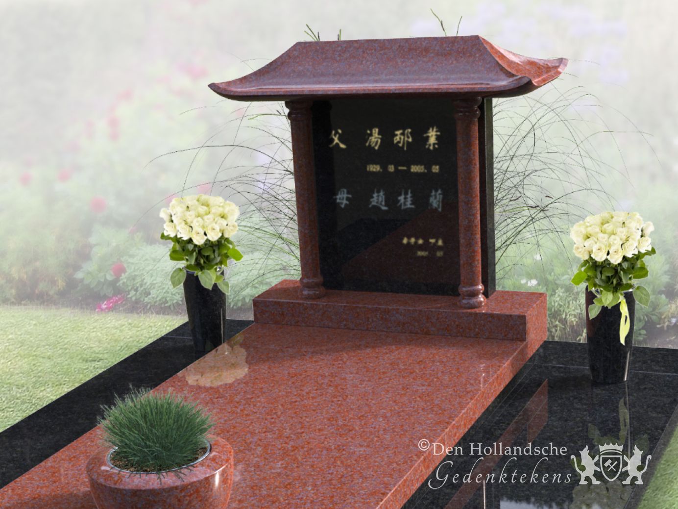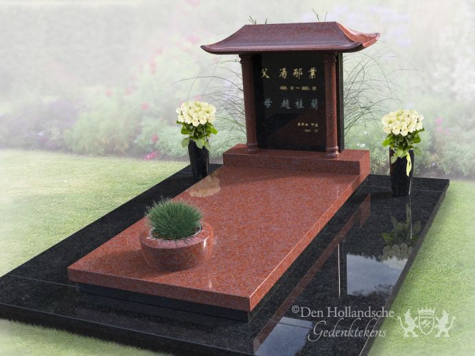 Chinees grafmonument met bloemen en plantenbak
