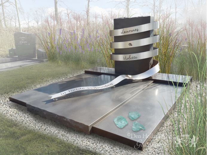 Dubbel grafmonument met RVS in combinatie met natuursteen. Het grafmonument wordt op sierlijke wijze omhelsd door de roestvast stalen band. Het geheel straalt sierlijkheid en rust uit.