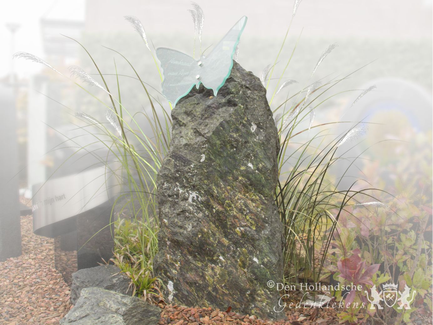 Deze grafsteen uit de natuur behoudt prachtige groene tinten. De vlinder van glas maakt het geheel een natuurlijke grafsteen.