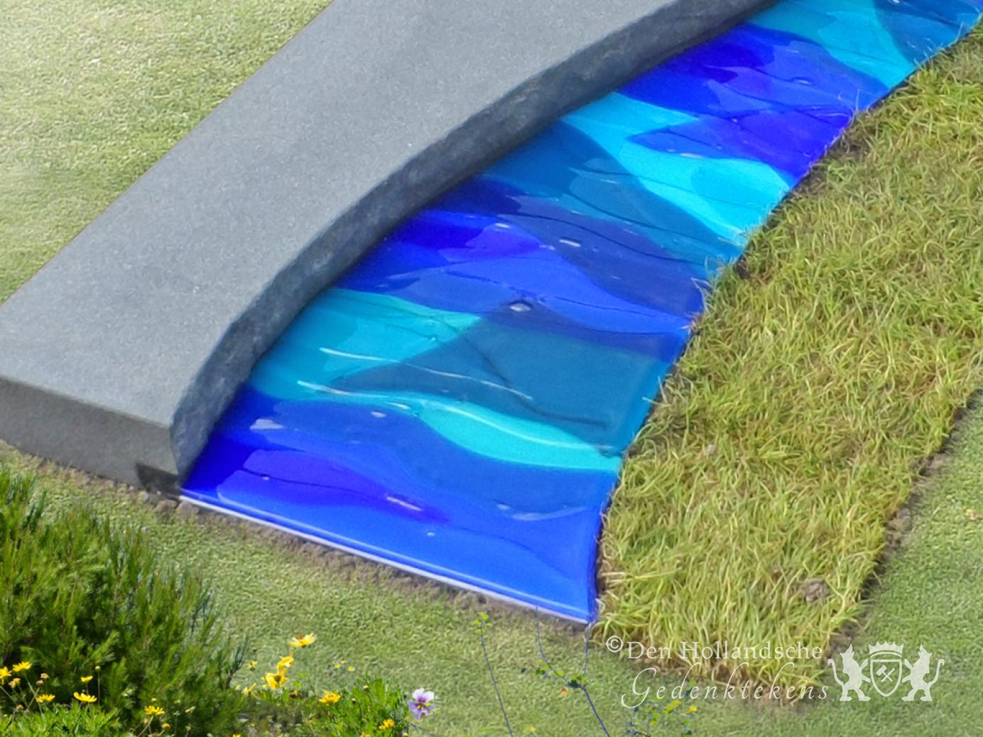 Grafzerk met glas en natuursteen. De glazen rivier bestaat uit samengesmolten blauwe stroken glas. De naam is in eigen handschrift van rvs op de zerk gemonteerd.