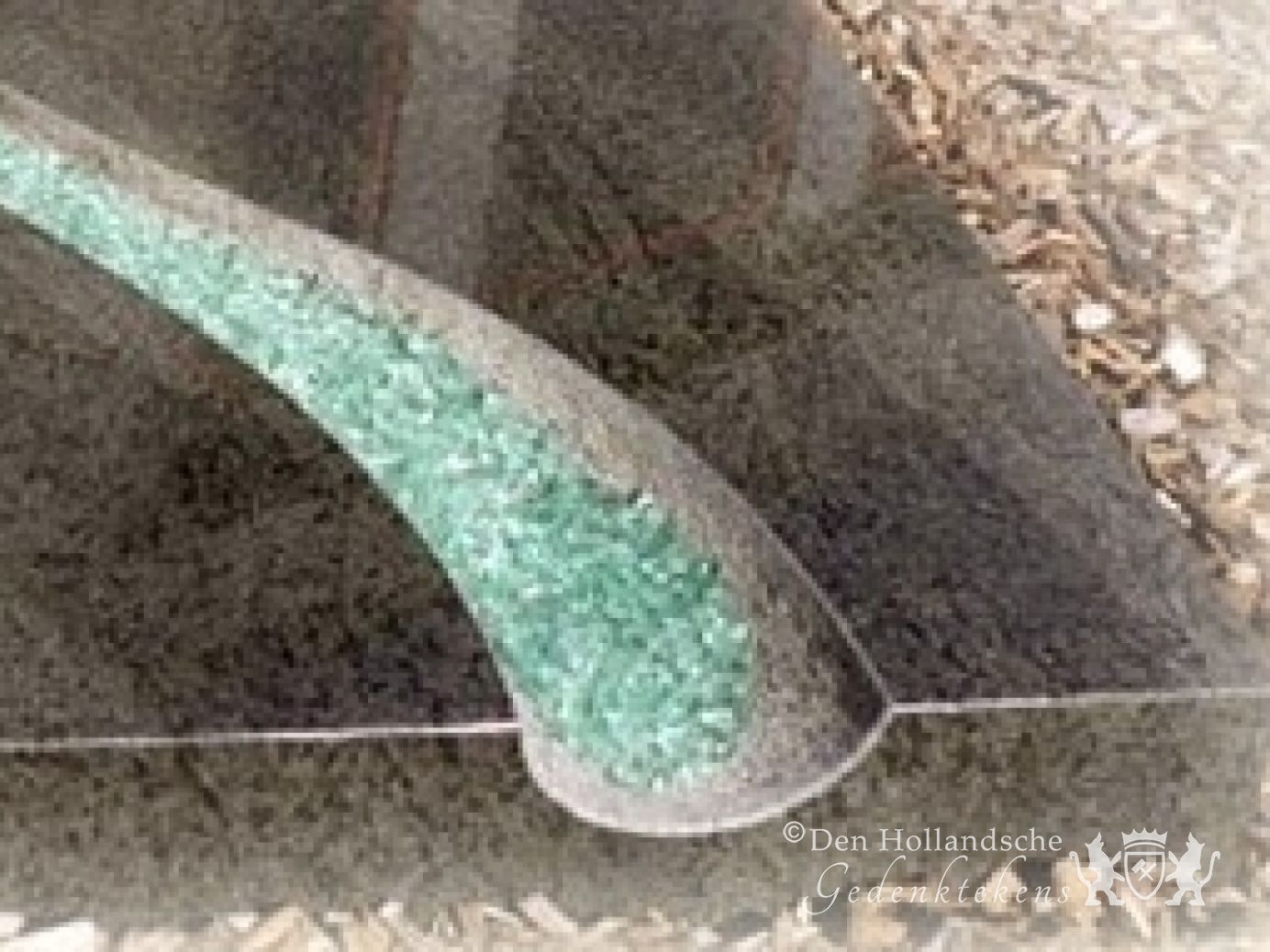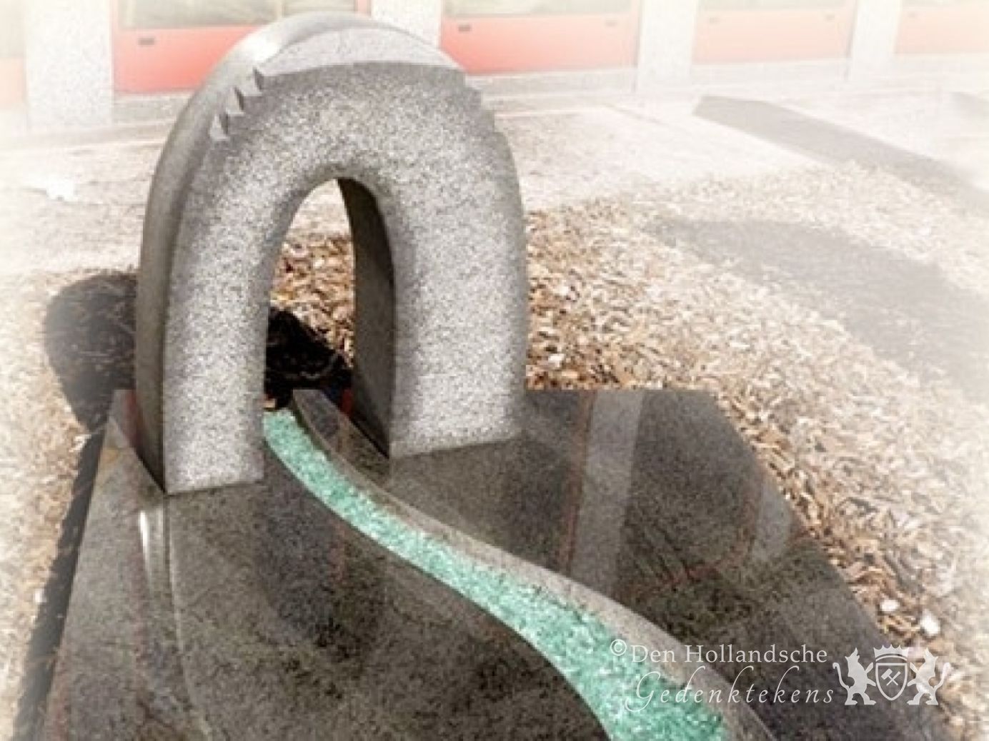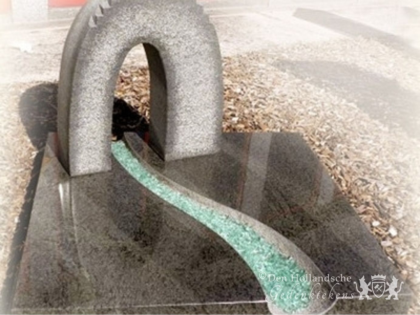 Gepolijste grafzerk waarin een glazen rivier is verwerkt. Over de rivier is een sierlijke natuurstenen boog geplaatst. Boog en rivier symboliseren de levensloop van een mensen en de doorgang naar het hiernamaals.