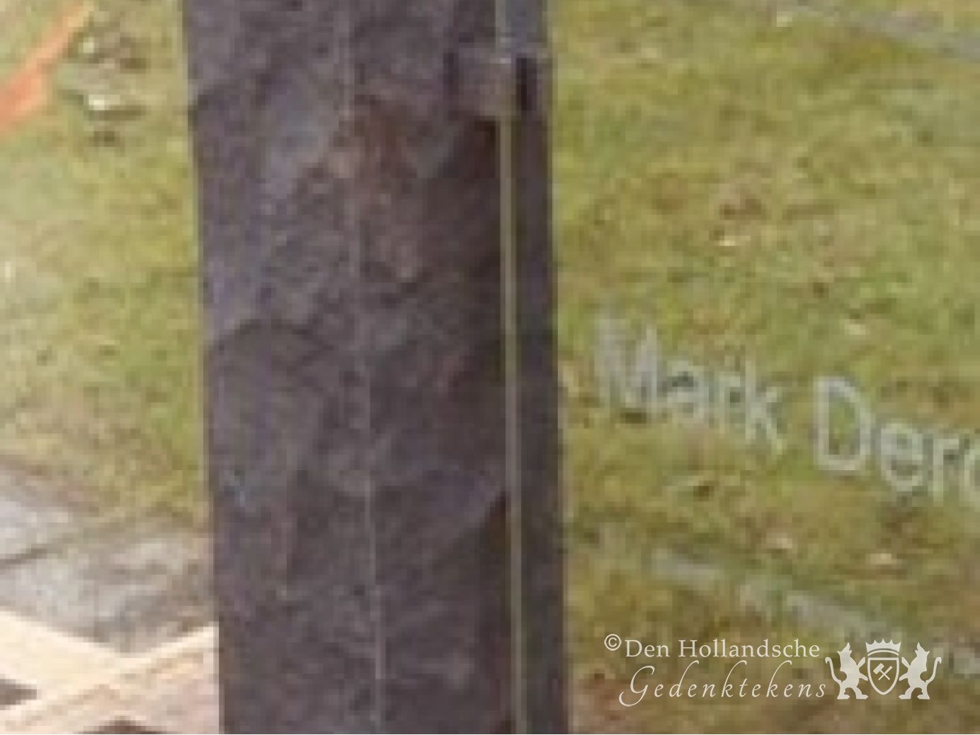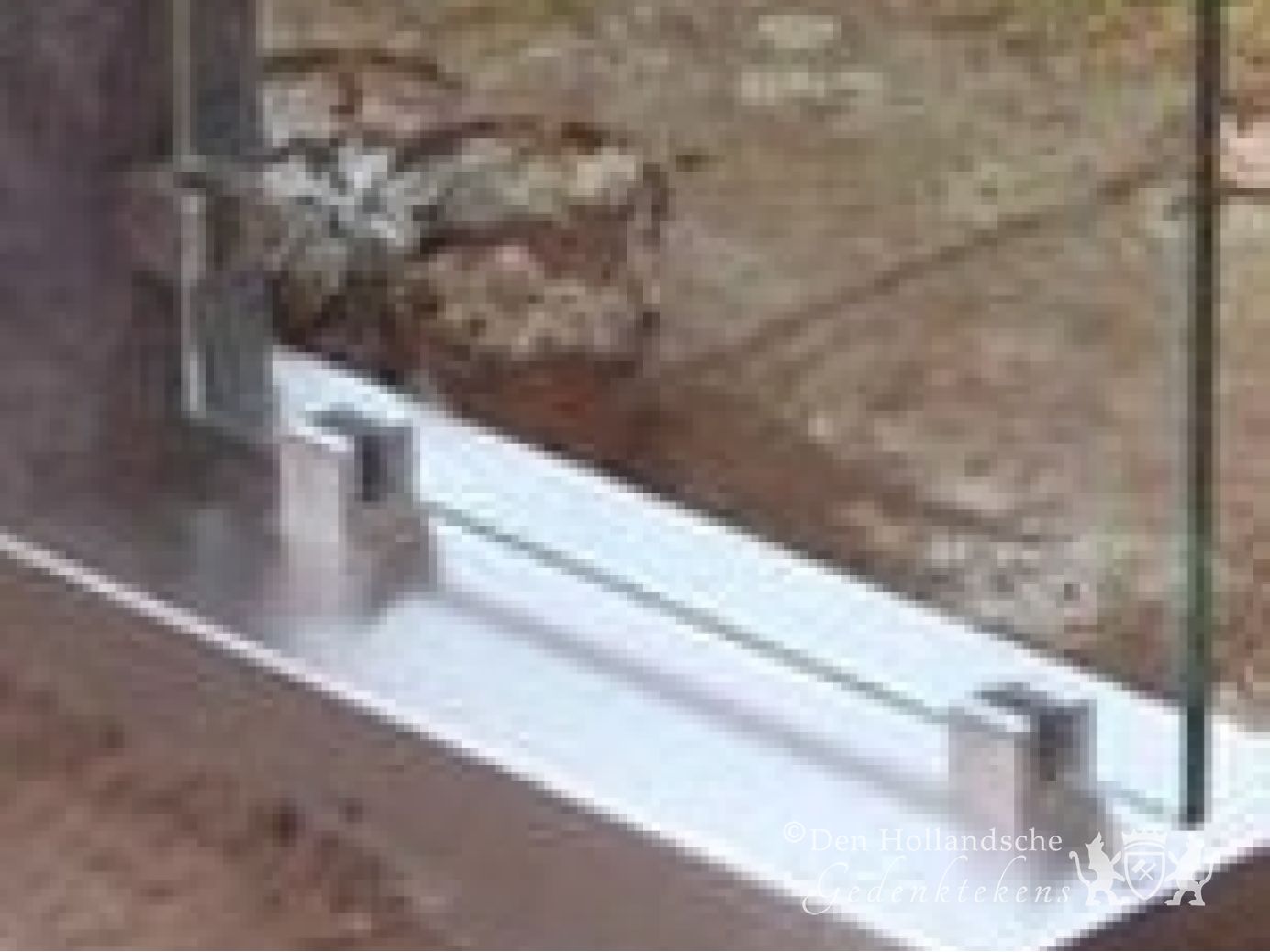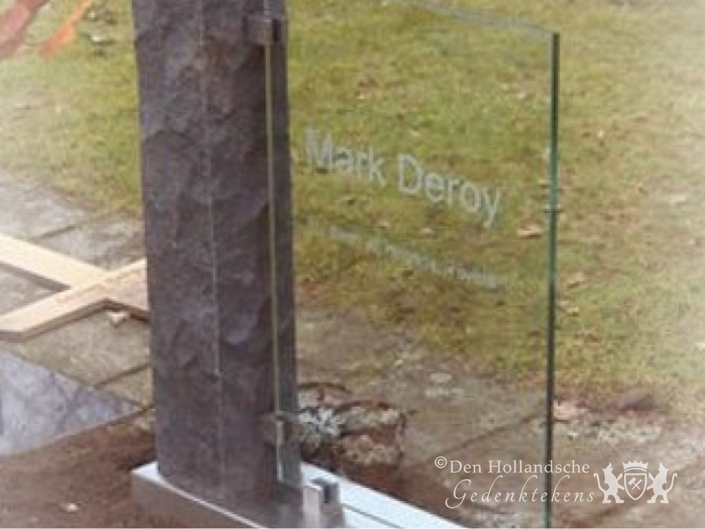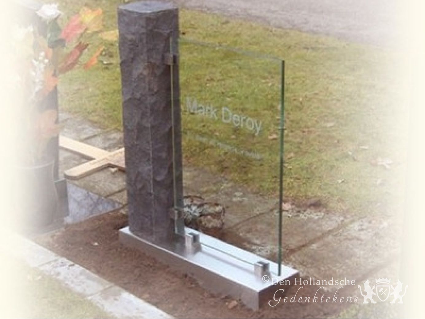 Het grafmonument bestaat uit een glazen tektstplaat die verbonden is met een ruw gehakte zuil. Het ruwe karakter van de zuil contrasteert met de strakke belijning van het glas. Het voetstuk is van RVS vervaardigd.