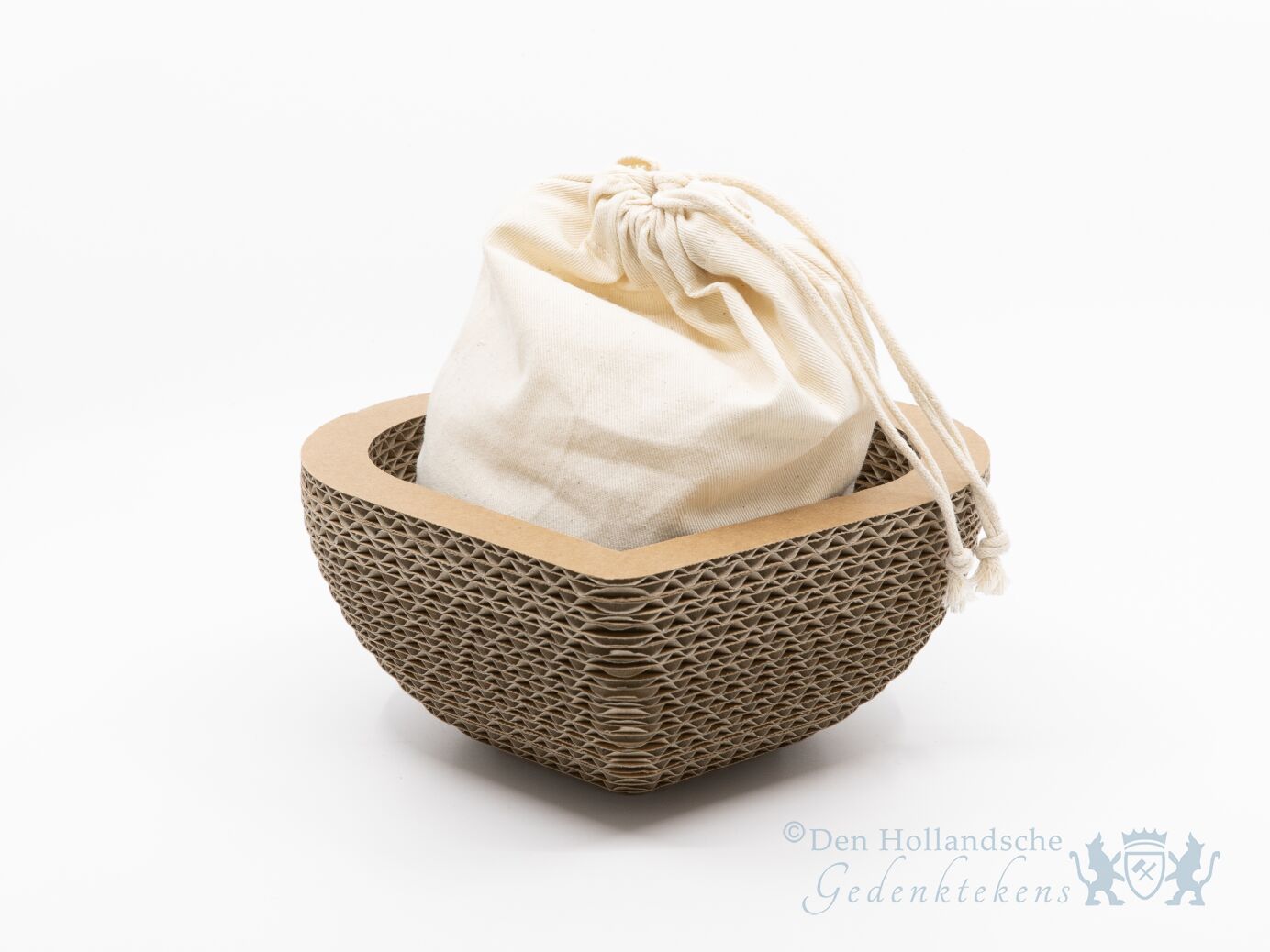 De Biourn is helemaal van deze tijd. De urn is vervaardigd vanuit karton, voorzien van een katoenen binnenzak en biologisch afbreekbare lijm en daardoor 100% biologisch afbreekbaar.