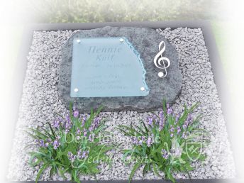 Zo goed als onderhoudsvrij grafmonument waar het opschrift is geplaatst op een glazen letterplaatje, waarbij één rand geknabbeld is uitgevoerd. Op het kussentje van natuursteen is een muzieknoot geplaatst van RVS.